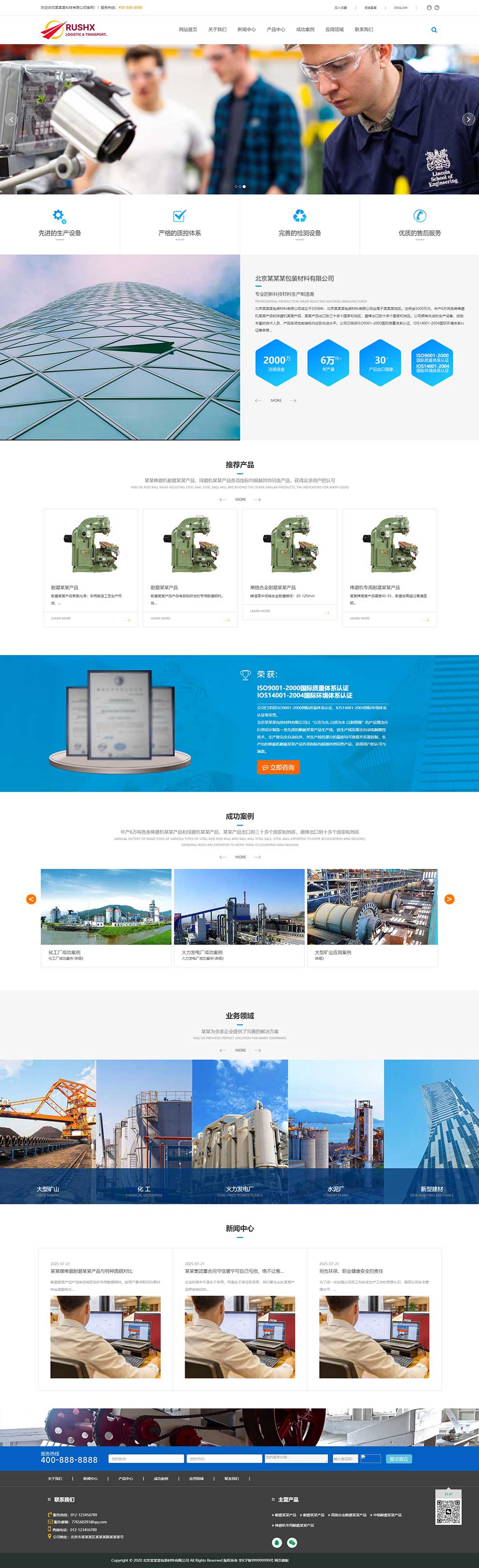 页面包含:网站首页、关于我们、产品中心、产品详情页、成功案例、案例详情页、应用领域、联系我们