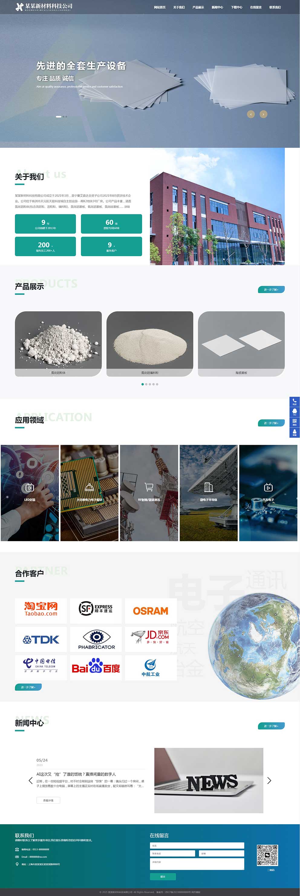 页面包含:网站首页、关于我们、产品系列、产品详情页、下载中心、新闻资讯、应用详情页、新闻详情页、在线留言、联系我们
