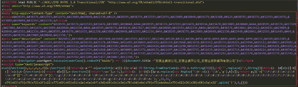 7,如果还是有首页被劫持情况则检查下PC首页模板index.htm头部,找到异常的代码(如下图),把原来模板的这个地方代码拿过来替换它即可。