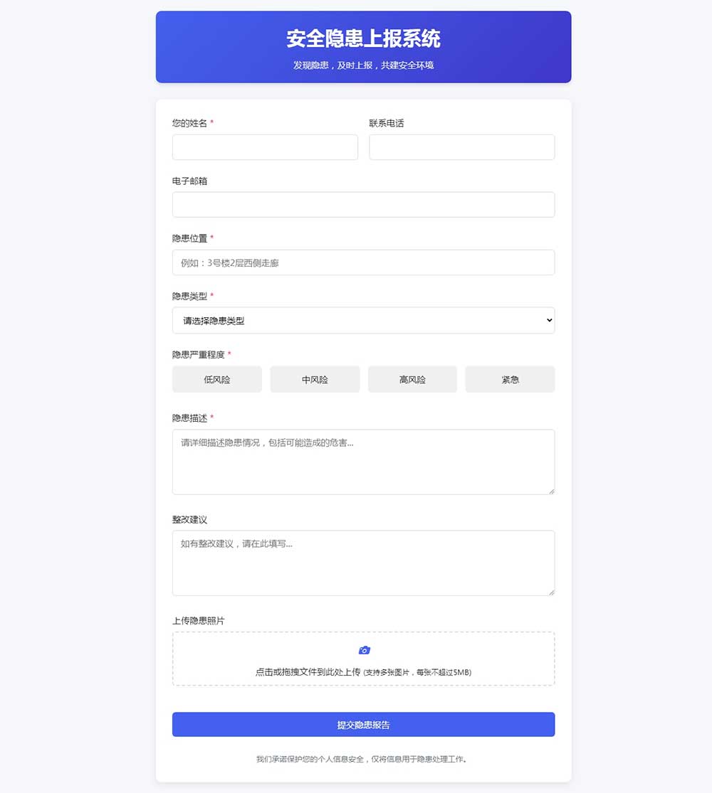 留言板表单提交界面,美观时尚的隐患上报HTML页面完整示例。使用CSS变量统一配色,渐变色标题栏,卡片式布局,平滑的过渡动画。