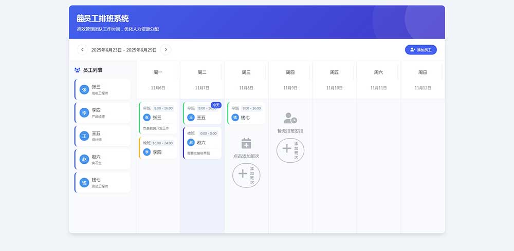 完整的排班系统 HTML 页面,包含基本的排班表布局、员工列表和排班功能。周视图排班表:显示一周七天的排班情况 员工列表:左侧显示可排班的员工 班次类型:使用不同颜色区分早班、晚班和夜班 周导航:可以切换到上一周或下一周。