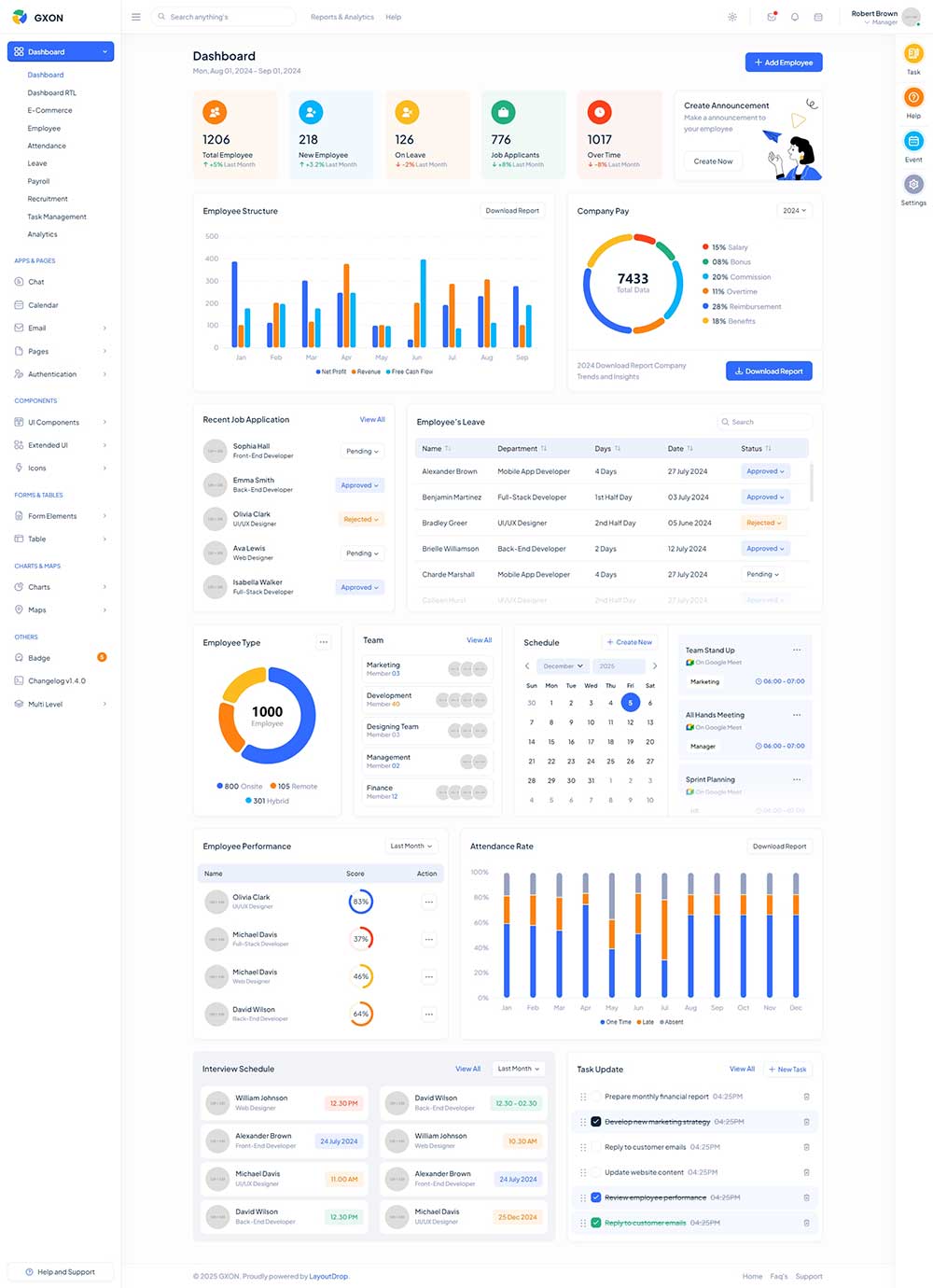 光模式和暗模式支持,人力资源、工资、休假、考勤页面聊天、电子邮件、日历应用现代用户界面与可重用组件开发者友好文件夹结构。